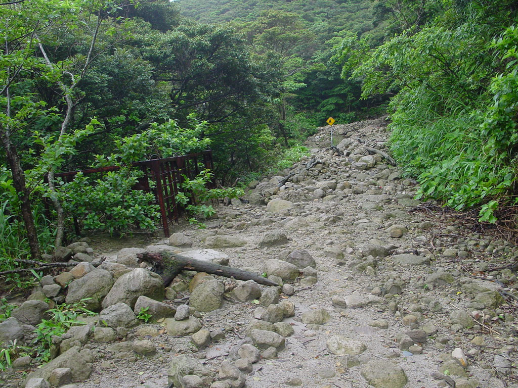 | 神津島北東部、お観音地区の林道を埋め尽くした土石流の写真をアップします。 2000年の地震活動後に発生したものですが、ほとんど人が立ち入らない場所の ため、最後に確認した2004年8月9日時点もそのまま残されていました。 写真は同年6月12日撮影のものです。 クリックで拡大表示します |