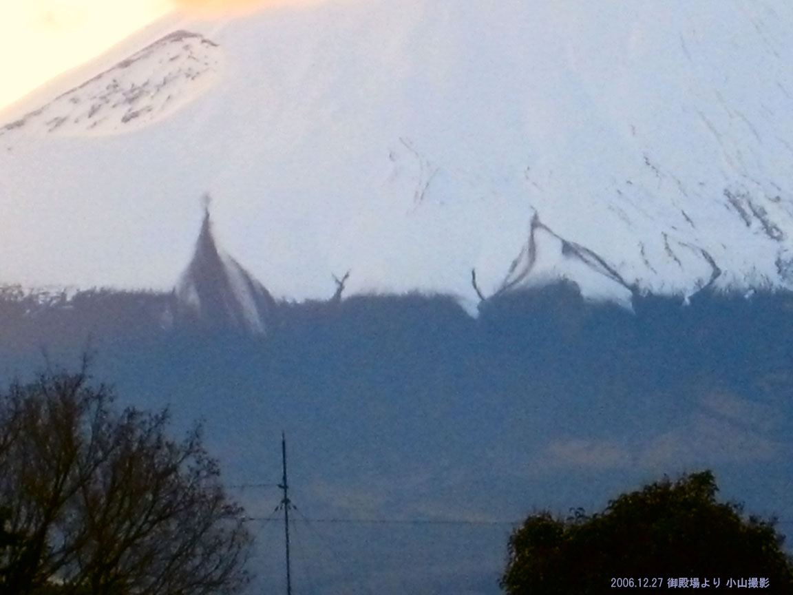 | こやまさん> ご指摘と写真をどうもありがとうございます。 ![]() 2006年12月27日の富士山東斜面の雪線付近の状況 (御殿場アウトレット駐車場より小山撮影) |
