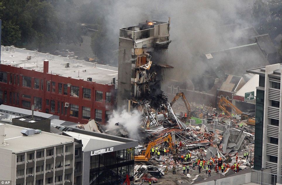 | 周りに比べても、特にこのビルだけが極端に壊れているようです 火災も発生したようです ![]() Rescue workers work to extinguish a fire at a collapsed building of King's Education in Christchurch |