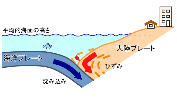 1.津波とは2004年12月26日に発生したスマトラ沖地震に伴うインド洋大津波は死者・行方不明者30万人以上という近年まれにみる大きな津波災害を引き起こしました.この地震はインド・オーストラリアプレートが東側のユーラシアプレートの下に沈み込む際に発生したもので,インドネシアのスマトラ島沖の長さ1300km以上の断層が動いて,マグニチュード9.0の大地震を引き起こしました. では津波はどうしてこのように大きな被害をもたらすのでしょうか?普通,風により生じる波浪は波長が数mで周期は長くても数10秒程度と短いので,波は陸に打ち寄せてもすぐ衰えてしまいます.これに対し津波は波長が数km以上,周期は数10分と長いため,津波は陸の奥まで侵入しその水位はなかなか低くなりません.津波のエネルギーはとても大きく,今回の津波が押し寄せる映像をみると,人のひざの高さていどの波でも人間は立っていることができませんでした.また,市街地に押し寄せた津波は通過する途中にあった,家屋,車,樹木などすべてのものを破壊し,これらの瓦礫の山が津波とともに人間を襲い被害を大きくしたのです. ↑このページの最初へ