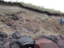 4.津波の痕跡を調べる津波がいつどこで発生する可能性が高いかを知るためには,過去にどのような津波が発生したかを詳しく調べる必要があります.記録の無い時代にどのような津波が発生したかを推定するにはどうしたら良いでしょうか?津波は陸上を駆け登る時に海底や海岸のレキや砂や土壌などを削り取り,津波が引いたあとにはこれらの堆積物が陸側に残されます.これを津波堆積物といいます.ある場所で地層の中に何層もの津波堆積物が重なっていて,その年代が判れば,津波の発生頻度を推定することができます.また,堆積物の分布を詳しく調べれば津波がどのような方向から陸上に侵入したのかといった津波の振る舞い方を復元することもできます. 北海道大樹町生花調査北海道の太平洋沿岸には地震による大小さまざまな規模の津波が繰り返し来襲しています.最近の津波堆積物の調査から400〜500年周期で大津波が発生したことが分っています.北海道東部の太平洋岸に位置する大樹町生花(たいきちょうせいか)では,海岸に近い湿地の地下から多数の津波堆積物が発見されています.このような津波堆積物の分布や堆積物中の粒子の大きさやレキの傾きの方向などを調べることにより,津波の侵入経路などが明らかになります. 北海道渡島駒ケ岳同じく北海道の南部に位置する渡島駒ヶ岳は1640年噴火で山体の一部が崩壊し,その崩壊物の一部は内浦湾に流れ込み津波を発生させ,湾の中の漁船が津波に巻き込まれたりして約700人が犠牲となりました.この津波についても陸上に残された津波堆積物の調査から,噴火湾沿岸に最大で10m程度の津波が押し寄せたことが分っています.このような津波の形成過程は,堆積物を構成する砂・レキの種類,粒子の大きさやそこに含まれている珪藻化石などの種類を調べることにより明らかになります. ↑このページの最初へ