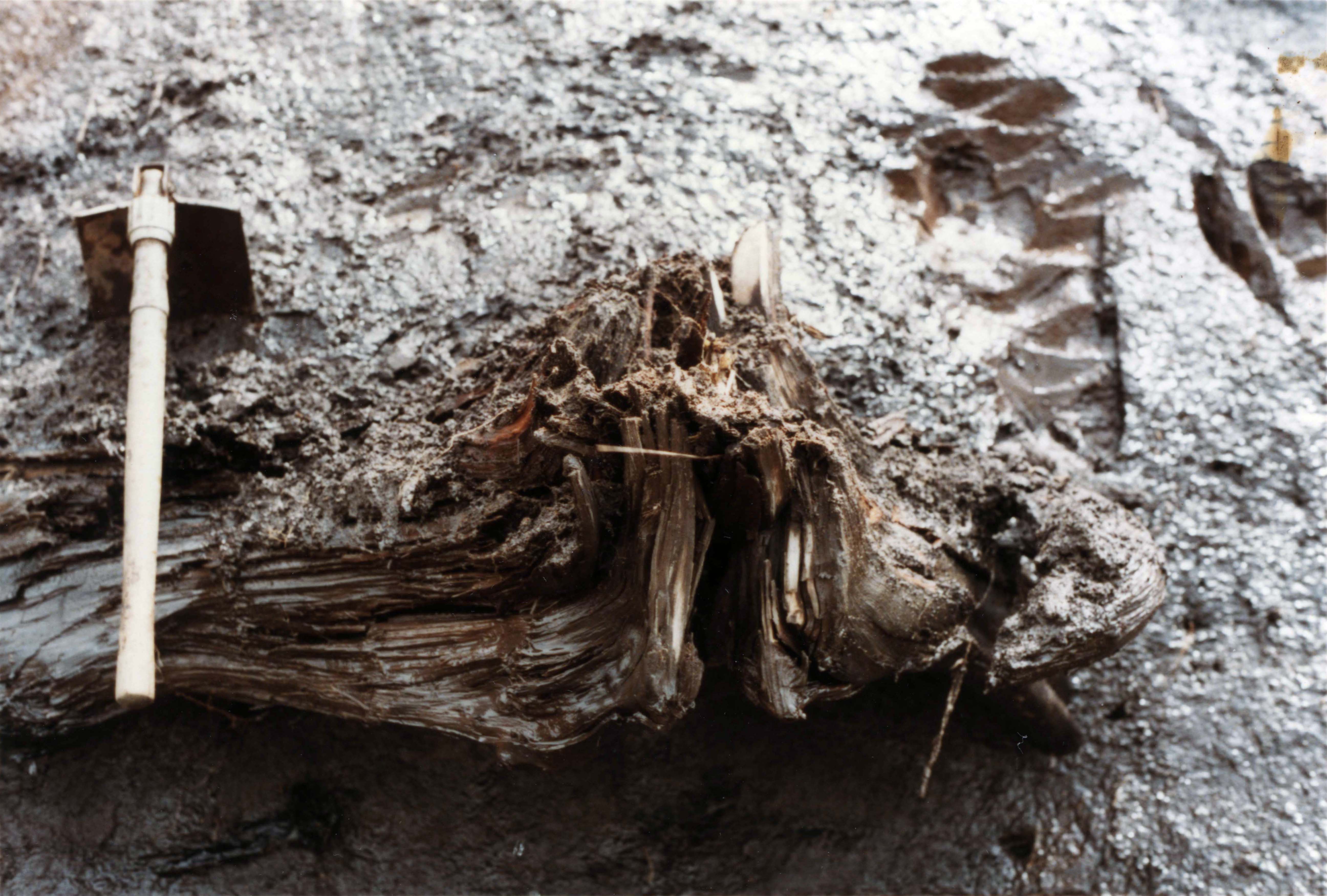 津軽半島のAT火山灰と埋没林青森県津軽半島の日本海側に沿って南北に伸びる出来島海岸には,海食崖に最終氷期以降の泥炭層が露出しています.その中には樹木の根株が並んでいるところがあり,かつて森林が存在したことがわかります(埋没林と呼ばれる).根株のすぐ上を覆うように薄い火山灰層が認められます.厚さは僅か1-2mmで,細い線を引いたような感じです(中央の写真の真ん中付近).この火山灰は鹿児島県の姶良カルデラから2.6〜2.9.万年前に噴出したAT火山灰[姶良Tnテフラ]です.東京都世田谷区で認められたAT火山灰については2007.7.27の記事参照.詳しくは日本大学文理学部自然科学研究所「研究紀要」を参照. 遠藤邦彦1980年 撮影更新日:080115 修正日:080121 ↑このページの最初へ