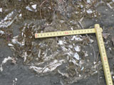 富士山の雪にダスト6月初旬頃から富士山の雪は急速に溶けていますが,やはり今年は昨年と同様雪の量が多く,この時期としては残雪の量が多いようです.新五合目の駐車場の脇に残っていた雪にはダストの層が何層も見られました(6月6日). ダストには砂粒大の黒色粒子(スコリア)が混じっていて,表面にはこれらが浮き出たようになっています(写真1).強風の吹く富士山では降った雪が地表の土壌粒子(スコリアを主体)と共に再移動し,吹き溜まりに溜まっていくような過程が起こっていると考えられます. 表面を削った内部は褐色の層が数層見られ,褐色の元は非常に細かな粒子です.削ったあとしばらくすると雪の最下層には細かな褐色の粒子が表面にべったり張り付いたようになります(写真3).上の方には雪が溶けた氷の薄層が見られます. このようにダストにもいろいろなものがありますが,大陸起源の黄砂も含まれている可能性があります. 5月に比べ,6月に入って富士山の雪は随分後退しています.この前後の様子を,富士山監視ネットワークの画像で比べてみました(詳しくは『富士山観測プロジェクト,富士山の雪』へ). ↑このページの最初へ