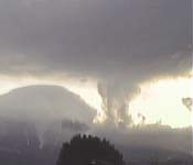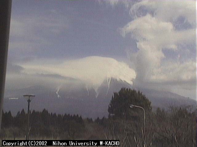 この日,発達した低気圧が関東の南東方にあり,北東ないし北北東の強風が吹いており,しかも高度別にみて,山頂付近に風速の極大がある状況(約25m/s;河口湖のウインドプロファイラで確認)のもと,富士山の風下側(南西または南南西)では乱気流が発生し続け,しかも対流圏全層で大気が不安定な状態であったため,高く立ち昇る高積雲(積雲形成過程で強風のため雲頂部がレンズ状となる)が生じたものとみられます。笠雲が山頂部にかかるということは山頂付近に安定層ができているわけですが,それにより山腹を迂回する流れが助長され,この迂回する流れの風下合流ポイントが高積雲の発生点となり,その渦(低気圧性循環が優勢のため反時計回りの渦)が巻き上がって高積雲を続々と形成したと考えられます。 更新日:080402 ↑このページの最初へ