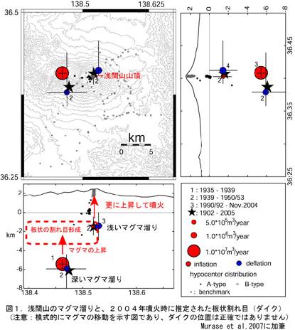 具体的に浅間山での「噴火警戒レベル」を気象庁ホームページで確認してみましょう. 引用ホームページ マグマの上がってくる経路(浅間山のマグマ供給システム)活動度が高い火山では観測がなされ,異常が見つかれば気象庁が噴火警報を出すということがわかりました. ![]() 例えば,マグマ溜りに代表されるように,火山の内部で球状にマグマが膨張したとしましょう.図aでは地下で球状の膨張が起こった場合の地表の変化を計算し示しています.火山が同心円状に膨らんでいるのがわかります.この地上の変化を観測することで,地下のマグマ溜りが膨張しているのではないかと推測できます. ![]() 特に深い場所にマグマ溜りがある場合は,マグマの蓄積による火山の膨張は,非常にわずかです(数mm/年のことも).この微小な変化を長年にわたり測定し続け,火山のマグマ溜りの位置やマグマの供給量を推定していきます. 図1は約100年間にわたり浅間山付近で測定された上下変動から,マグマ溜り(圧力源)を推定したものです.浅間山の山頂西側の海抜−6kmの場所に深いマグマ溜りが,山頂の真下の海抜−1.5kmに浅いマグマ溜りがあることが分かりました(Murase et al.,2007). さらに2004年に噴火した時の地殻変動によって,この深いマグマ溜りからマグマが上昇し南北に伸びる垂直の板状の割れ目(図中の赤色破線の四角形領域)を作って噴火に至ったことがわかりました(Takeo et al.,2006). ![]() また図2は,マグマ溜りが1902年〜2005年の間にどの程度膨張したかを示しています(Murase et al.,2007).図2の下の棒グラフは噴火回数で,マグマが大量に供給され急激に深いマグマ溜りが膨張した時には,活発に噴火がおきていることが分かります.また,最近を見てみると,1940年代と比べれば減少したものの安定的な膨張は深いマグマ溜まりで継続しています.この定常的なマグマ供給が続いている限り,最近の数10年のような短期的なブルカノ式噴火活動と休止を繰り返す活動が続きそうです.