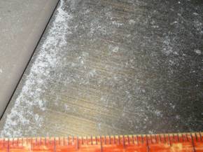 2月2日22時に浅間山の南東123kmの地点で撮影した写真です.左側の写真は降灰したままの状況を撮影したものです.よく見ると金属面上にむらはあるもののほぼ一様に堆積するほこりのような細粒な火山灰のほかに直径0.2〜0.5o程度の凝集粒子がまばらに堆積している様子を確認できます(写真6左).この写真の約50cm右側で2日10時に定面積試料を採取しました.当然,試料採取直後には火山灰は残っていませんでした.ところが, 22時にこの場所をみるとまばらではありますが直径0.5〜1.0o程度の新たな凝集粒子を確認できました(写真6右).すなわち,10時から22時の間に新たな降灰があったということになります.聞き取り調査によれば同地点では8時頃に掃除をしたものの17時頃,掃除跡に降灰を確認したとの証言もあります.このことから稲城市では噴火発生の1:51から10時までの間の他に10時から17時までの間にも降灰があったと思われます.この日に府中〜新宿にかけて活動していた学生や卒業生に聞くと花粉や黄砂が降ったときのように目のかゆみなどの異常を感じる人が多かったようです.これは単に一度降った火山灰が舞い上がっただけではなく,降灰が降り続いていたためだったからかもしれません.